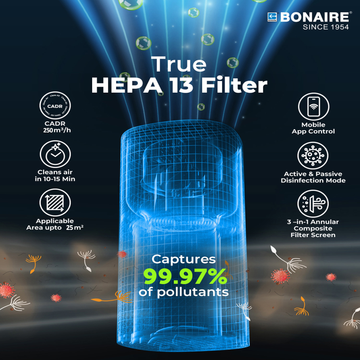 - A HEPA13 (High-Efficiency Particulate Air) filter captures 99.97% of particles as small as 0.3 microns, including dust, pollen, Mold spores, pet dander, and other Airborne particles.