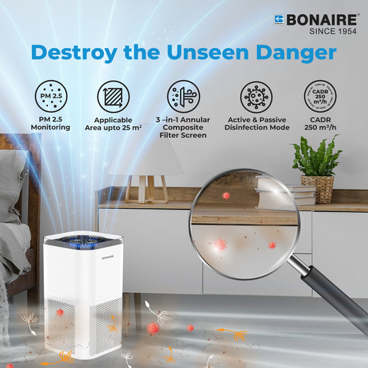BONAIRE A4S AIR PURIFIER: Removes allergens, dust, smoke, odor, pet hair, dander, air pollutants etc. The coverage area upto 1076 sq. ft. CADR is 150 CFM and Noise Level will be 26-60 dB.